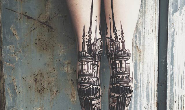 Κάθε τατουάζ χρησιμοποιεί τολμηρές γραμμές αποτυπώνοντας μαύρα σχήματα που απεικονίζουν ιστιοφόρα, ακτίνες του φωτός, πύργους μπαρόκ στυλ των οποίων οι σπείρες εκτείνονται μέσα από τα σύννεφα. Δεν υπάρχει χρώμα ή σκίαση στα εντυπωσιακά τατουάζ και έτσι ο δημιουργός επικεντρώνεται στη λεπτομερή τους απόδοση. Τα σχέδια, ένα σε κάθε πόδι, σχηματίζουν μια συνέχεια και ένα δίπτυχο καθώς το άτομο στέκεται με τα πόδια ενωμένα.