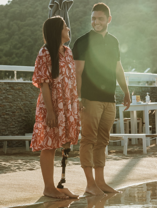 Ήταν η πρώτη μου σχέση στα 23. Είχα, βέβαια, πλατωνικούς έρωτες πιο πριν. Μάλιστα, ο Σάκης δεν το ήξερε, παρόλο που ζούσαμε στην ίδια πόλη και κούτσαινα. Πίστευα ότι το ήξερε αλλά όχι. Μια μέρα, στην αρχή της σχέσης μας, του λέω: Να σου πω, έχεις παρατηρήσει ότι κουτσαίνω; Λέει ναι. -Ξέρεις τι έχω; Μου λέει: Όχι, τι; Και του δείχνω τότε μια φωτογραφία του Πιστόριους. -Το βλέπεις αυτό το πόδι; Φοράω τέτοιο. Έμεινε στην αρχή, λίγο. Του είπα στην ψύχρα τότε: Αν θέλεις να φύγεις, φύγε τώρα. Μην μείνεις και μετά… Και δεν έφυγε ποτέ. Ήμουν ξεκάθαρη.