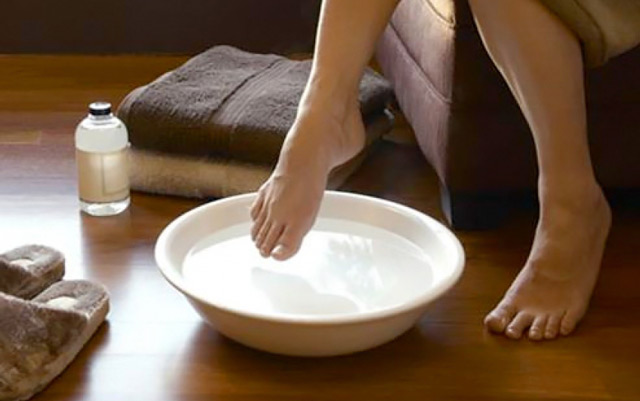 Για ένα χαλαρωτικό μασάζ στα πόδια που θα διώξει οσμές και θα κάνει μαλακό το δέρμα σας, ρίξτε ένα φλιτζάνι μηλόξυδου σε ένα spa ποδιών ή σε μια μεγάλη λεκάνη με ζεστό νερό. Αφήστε τα πόδια σας να μουλιάσουν για περίπου 15΄ για να μειώσετε την κούραση και το πρήξιμο. Το ξύδι θα διαπεράσει το δέρμα σας και θα κάνει ευκολότερη την αφαίρεση των σκληρών και ροζιασμένων σημείων των ποδιών σας, αν χρησιμοποιήσετε στη συνέχεια μια ελαφρόπετρα.